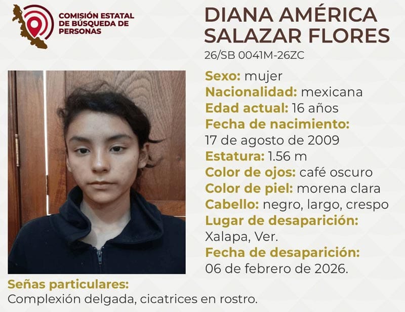Entre las jóvenes buscadas se encuentra Diana América Salazar Flores, de 16 años, quien mide 1.56 metros, tiene cabello negro, largo y crespo, y presenta cicatrices en el rostro como señas particulares.