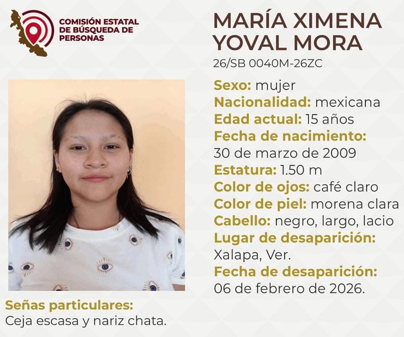 De igual forma, se trabaja en la localización de María Ximena Yoval Mora, de 15 años, de tez morena clara, 1.50 metros de estatura, cabello largo y lacio, y cejas escasas.