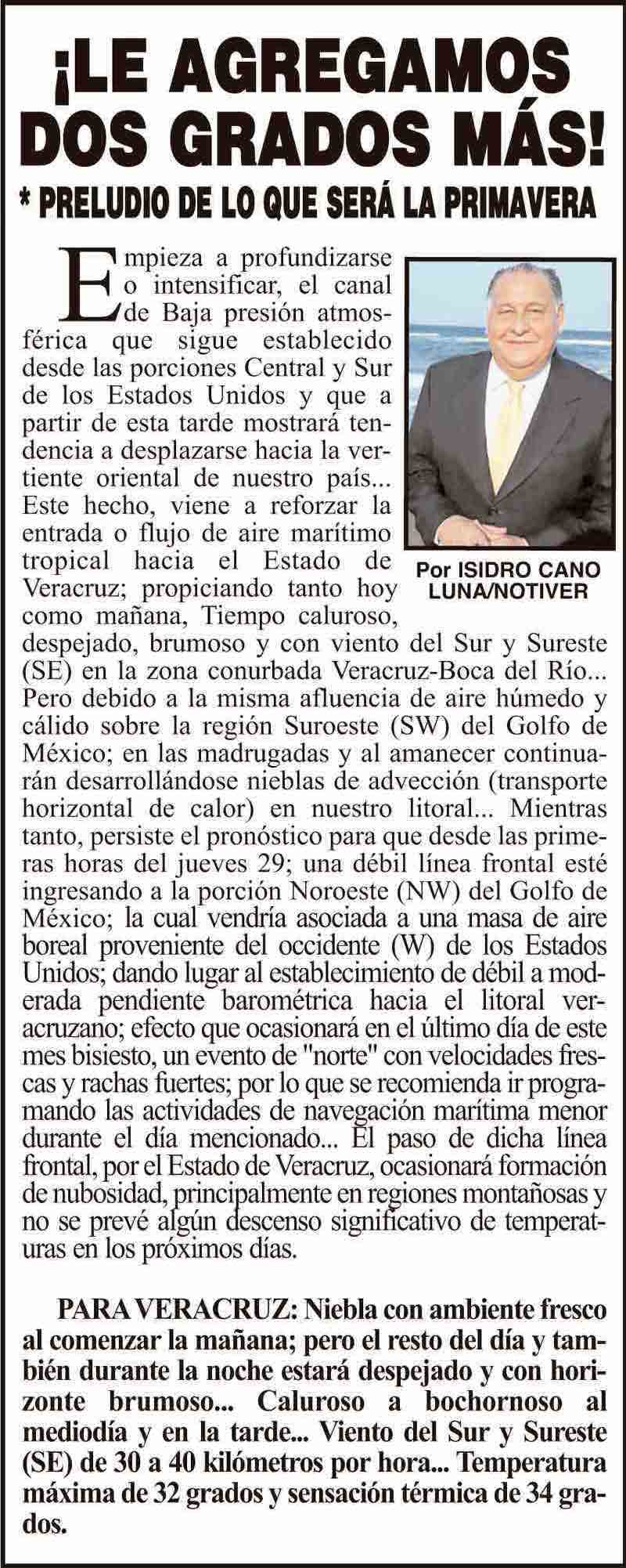 PRIMERA ¡LE AGREGAMOS DOS GRADOS MÁS! * PRELUDIO DE LO QUE SERÁ LA PRIMAVERA 27 febrero 2024 Más Noticias ¡YA HAY TERNA! - RAÚL PEIMBERT EN LA LISTA ¡“CEMENTERIO”! - DE ULÚAS ¡INAUGURA PATY OTRA CALLE! ¡NO LE CREYERON! - Y LO BUSCAN NOTI-MEME | - ECOS DEL INFORME! ¡VERÓNICA VA CON NAHLE! - Y AL CONGRESO ¡“FAST TRACK”! - *Mientras el Mariner salía y entraba de Pajaritos en Coatzacoalcos ¡OPERATIVO LUPE-REYES! ¡MANDAN LA BILLETIZA! - *Corea manda 150 mil dólares ¡CRISTINA GANA LA ELECCIÓN!