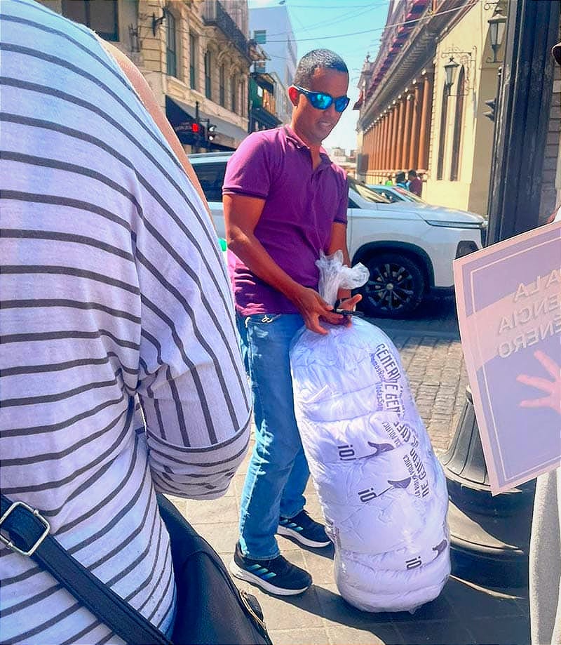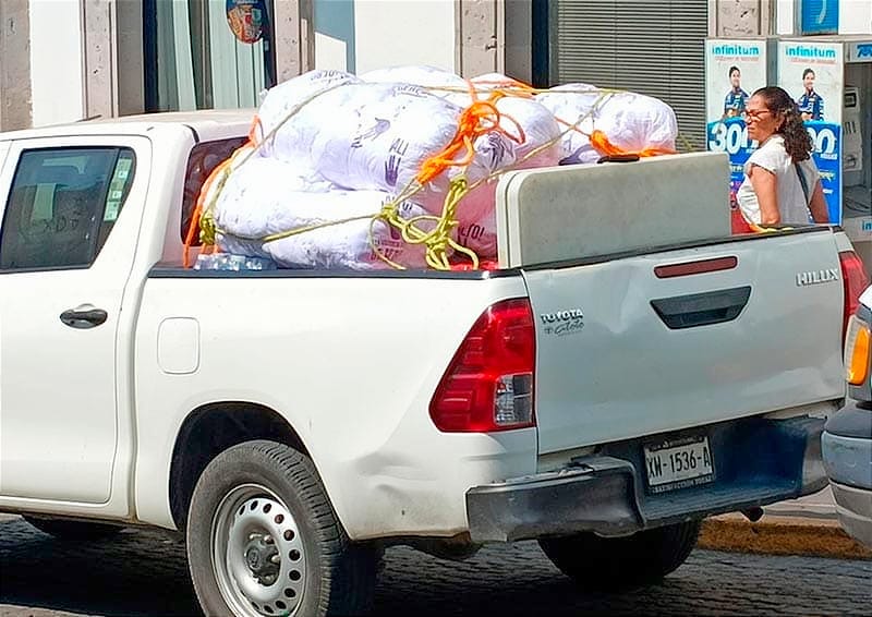 En camiones de renta, los contingentes fueron llegando a la zona centro de la ciudad donde los organizadores- hombres- les repartieron playeras, banderas, sombrillas y demás elementos para que caminaran por las calles.