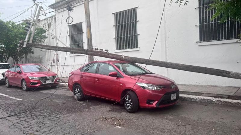 Según el testimonio de la señora Claudia Elena Canales Abarca alrededor de las dos de la mañana de este miércoles se sintió un fuerte viento que provocó la caída del poste de CFE provocando que un conjunto de 18 departamentos se quedarán sin luz, además de que su vehículo resultó afectado al caerle el poste encima.