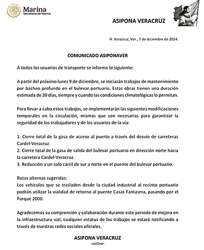 La administración del Sistema Portuario Nacional, Asipona, dio a conocer en un comunicado que a partir del próximo lunes 9 de diciembre se iniciarán los trabajos de mantenimiento por bacheo profundo en el bulevar portuario, por lo que habrá cierre de vialidades y cambio de accesos.
