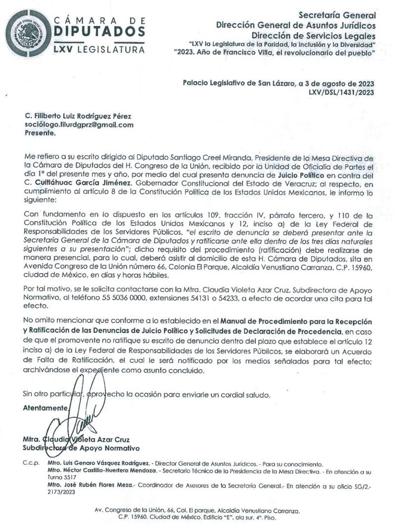 El documento fechado a 3 de agosto LXV/DSL/1431/2023, es un seguimiento a una solicitud que se hizo directamente al diputado Santiago Creel Miranda, presidente de la mesa directiva de la Cámara de Diputados con licencia.