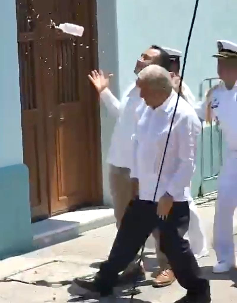 Dos botellas de plástico, cuatro huevos y un plátano fueron los proyectiles que personas arrojaron en contra del presidente de la república, Andrés Manuel López Obrador, a su llegada a la Casa de Benito Juárez, en el centro histórico de la ciudad de Veracruz.