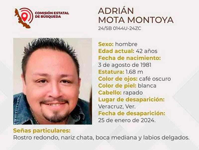 Adrián Mota Montoya fue reportado como desaparecido el pasado 25 de enero de 2024, de 42 años, tez blanca, color de ojos café oscuro y cabello rapado.
