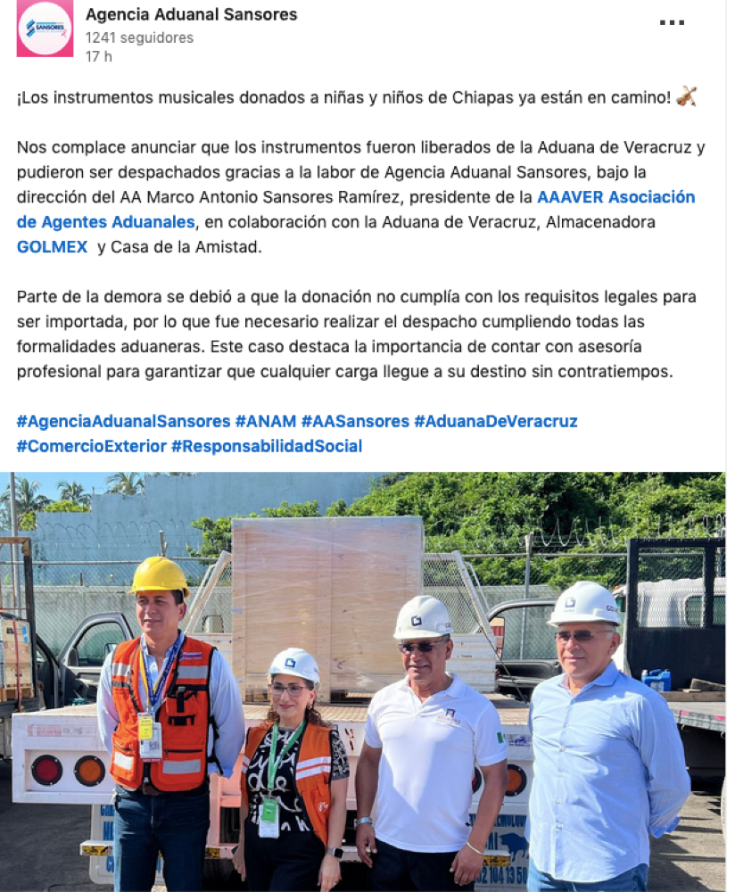 (AVC) Este viernes fueron finalmente despachados los instrumentos musicales donados a niñas y niños del estado de Chiapas, tras concluir satisfactoriamente su proceso de despacho aduanal en el Puerto de Veracruz.