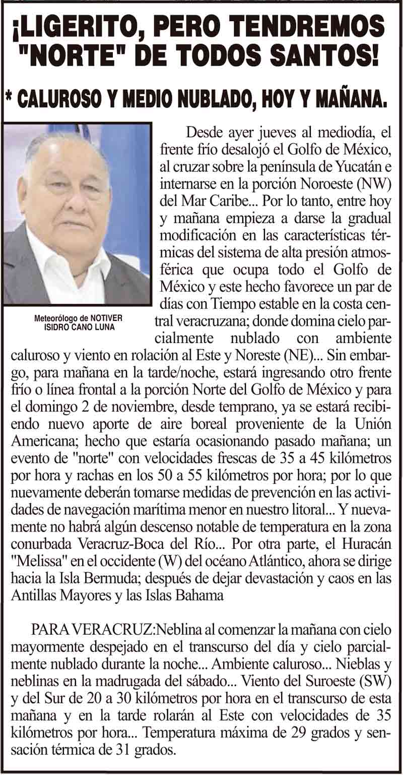 PRIMERA ¡LIGERITO, PERO TENDREMOS "NORTE" DE TODOS SANTOS! - *CALUROSO Y MEDIO NUBLADO, HOY Y MAÑANA. 31 octubre 2025 Más Noticias LA ENCUESTA | - ME ESTÁS OYENDO INÚTIL?... ¡CON BAILONGOS QUIEREN AYUDAR A LOS DAMNIFICADOS DEL NORTE! - *El mismo Alor, toca los timbales ¡YA SE LA APROBARON! - REFORMA PARA LA FISCALÍA ESTATAL NOTI-MEME | - ASÍ ESTUVO EL INFORME... ¡MÁS DE 9 MIL MILLONES! - *Eso costaría cancelar en Veracruz al Grupo MAS ¡LE DAN LUZ VERDE! - DESDE GUATEMALA ¡EL CUARTO! ¡Y COM-PA-RE-CIÓ! - ÁNDALE... ¡NO SE VA LISBETH AURELIA! - *Descarta ir a la Fiscalía y que seguirá como magistrada ¡CREAN EL SÚPER MAÍZ!