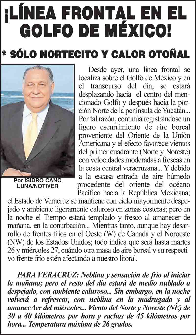 PRIMERA ¡LÍNEA FRONTAL EN EL GOLFO DE MÉXICO! * SÓLO NORTECITO Y CALOR OTOÑAL 19 diciembre 2023 Más Noticias ¡YA HAY TERNA! - RAÚL PEIMBERT EN LA LISTA ¡“CEMENTERIO”! - DE ULÚAS ¡INAUGURA PATY OTRA CALLE! ¡NO LE CREYERON! - Y LO BUSCAN NOTI-MEME | - ECOS DEL INFORME! ¡VERÓNICA VA CON NAHLE! - Y AL CONGRESO ¡“FAST TRACK”! - *Mientras el Mariner salía y entraba de Pajaritos en Coatzacoalcos ¡OPERATIVO LUPE-REYES! ¡MANDAN LA BILLETIZA! - *Corea manda 150 mil dólares ¡CRISTINA GANA LA ELECCIÓN!