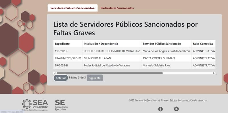 El Sistema Estatal Anticorrupción (SEA) ha integrado a la Plataforma Digital Anticorrupción de Veracruz los nombres de los primeros quince exservidores públicos sancionados por faltas administrativas graves.