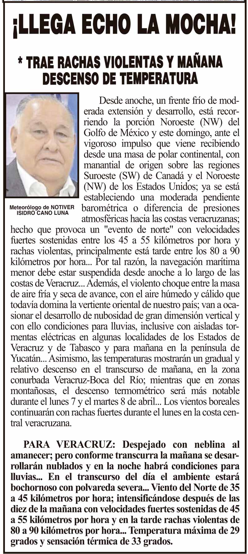 PRIMERA ¡LLEGA ECHO LA MOCHA! - *TRAE RACHAS VIOLENTAS Y MAÑANA DESCENSO DE TEMPERATURA 6 abril 2025 Más Noticias ¡ASESINAN A EX CANDIDATO A LA ALCALDÍA DE MISANTLA! - *Era del Movimiento Ciudadano ¡HOMENAJE PÓSTUMO AL “PAPO”! ¡SE VA EL FOFO! - DEL PRI LA ENCUESTA | - FELICIDADES! ¡SE DESCARRILA EL TREN! - PA’SUSTO ¡YA NO COBRARÁN PARQUÍMETROS! ¡SE VAN POR LAS NUBES LOS PAVOS! ¡DETECTAR DISFAGIA A TIEMPO PREVIENE LAS COMPLICACIONES DE SALUD: IMSS VERACRUZ NORTE! ¡CUATRO MUNICIPIOS SUBIRÁN EL PREDIAL! - YA SE SUPO ¡CUMBRE DE TRANSPORTE MULTIMODAL!