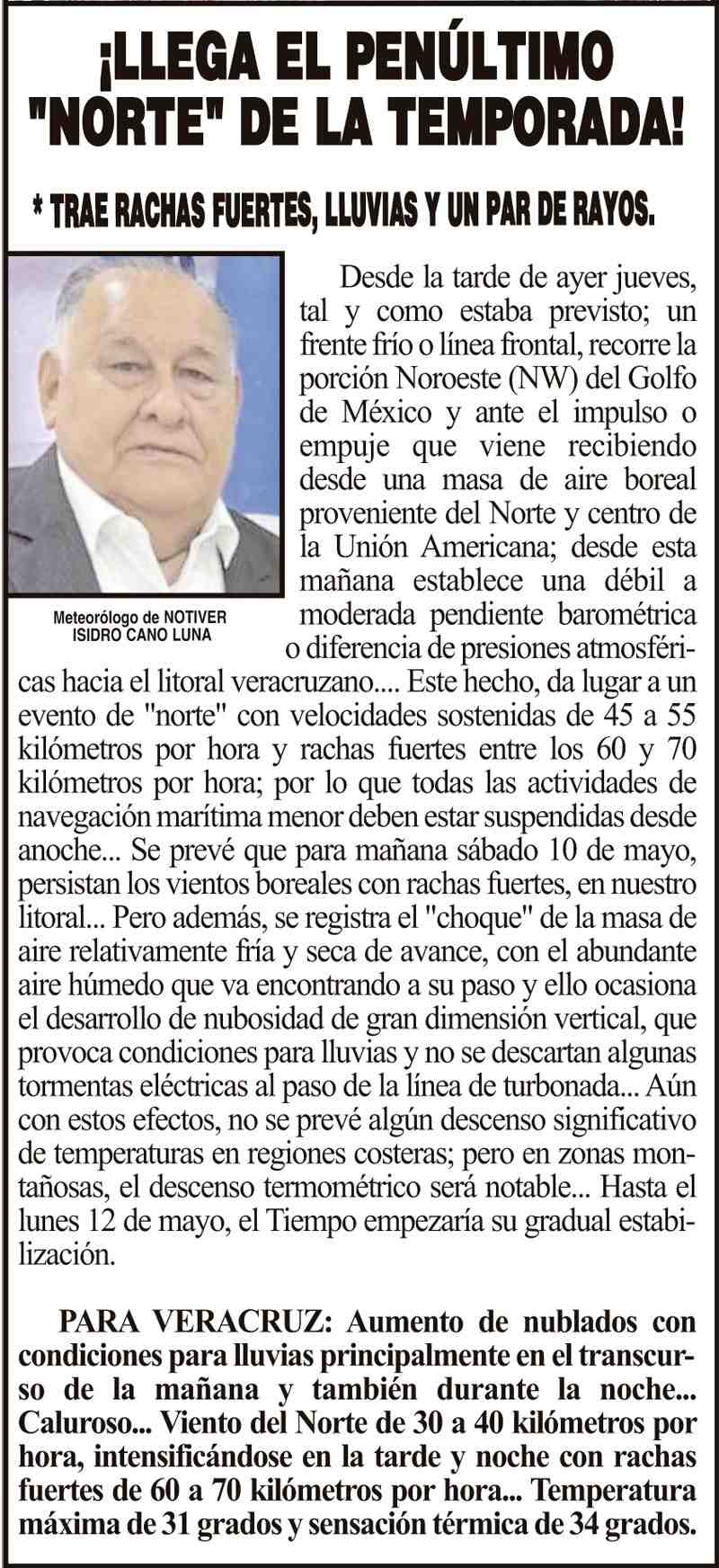PRIMERA ¡LLEGA EL PENÚLTIMO "NORTE" DE LA TEMPORADA! - *TRAE RACHAS FUERTES, LLUVIAS Y UN PAR DE RAYOS... 9 mayo 2025 Más Noticias ¡CAZARÍN LE TRAJO LA BILLETIZA! - A LOS ABUELITOS ¡NO HAY AGUA EN OCHO COLONIAS! - *Por una fuga en la red ¡EJECUTAN A FOTÓGRAFO! - EN CÓRDOBA ¡SENTENCIA HISTÓRICA! - CASO ASCENCIO ¡OTRA CALLE MÁS! ¡MUERE DIEGO FERNÁNDEZ! - “EL PAMPANO” ¡FALLECE HERMANO DE REYNALDO! ¡METEN TIJERA! - MOLES ¡SE COLAPSÓ! - EL COCOTERO DE ÁLAMO LA ENCUESTA | - CATAPLÚM!