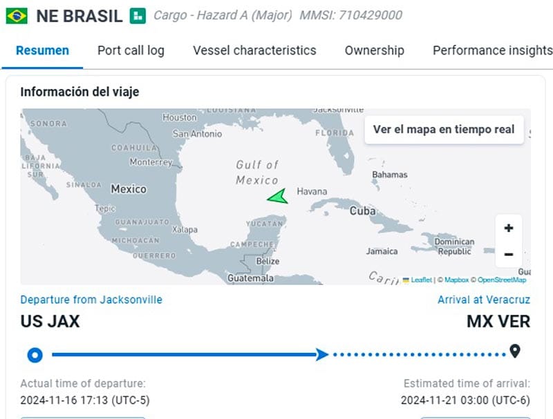 De acuerdo a Marine Traffic el barco viene de Jacksonville, la noche de este martes estaba entrando en aguas del Golfo de México.