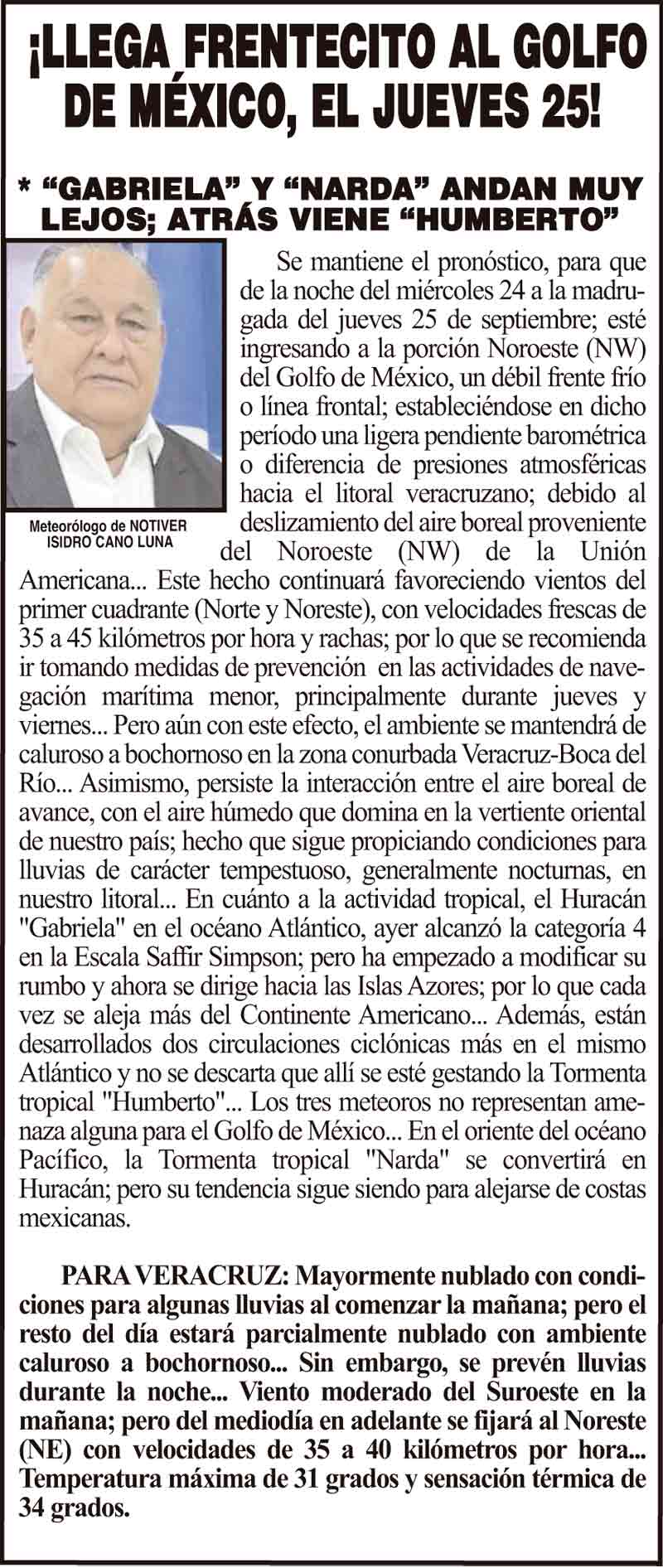 PRIMERA ¡LLEGA FRENTECITO AL GOLFO DE MÉXICO, EL JUEVES 25! - *“GABRIELA” Y “NARDA” ANDAN MUY LEJOS; ATRÁS VIENE “HUMBERTO” 23 septiembre 2025 Más Noticias ¡HOY SOPLA FRESCO Y DE FRENTE! - *PERO EL LUNES 8, ESTARÁ FUERTE Y CON LLUVIAS. LA ENCUESTA | - ME ESTÁS OYENDO INÚTIL?... ¡CON BAILONGOS QUIEREN AYUDAR A LOS DAMNIFICADOS DEL NORTE! - *El mismo Alor, toca los timbales ¡YA SE LA APROBARON! - REFORMA PARA LA FISCALÍA ESTATAL NOTI-MEME | - ASÍ ESTUVO EL INFORME... ¡MÁS DE 9 MIL MILLONES! - *Eso costaría cancelar en Veracruz al Grupo MAS ¡LE DAN LUZ VERDE! - DESDE GUATEMALA ¡EL CUARTO! ¡Y COM-PA-RE-CIÓ! - ÁNDALE... ¡NO SE VA LISBETH AURELIA! - *Descarta ir a la Fiscalía y que seguirá como magistrada