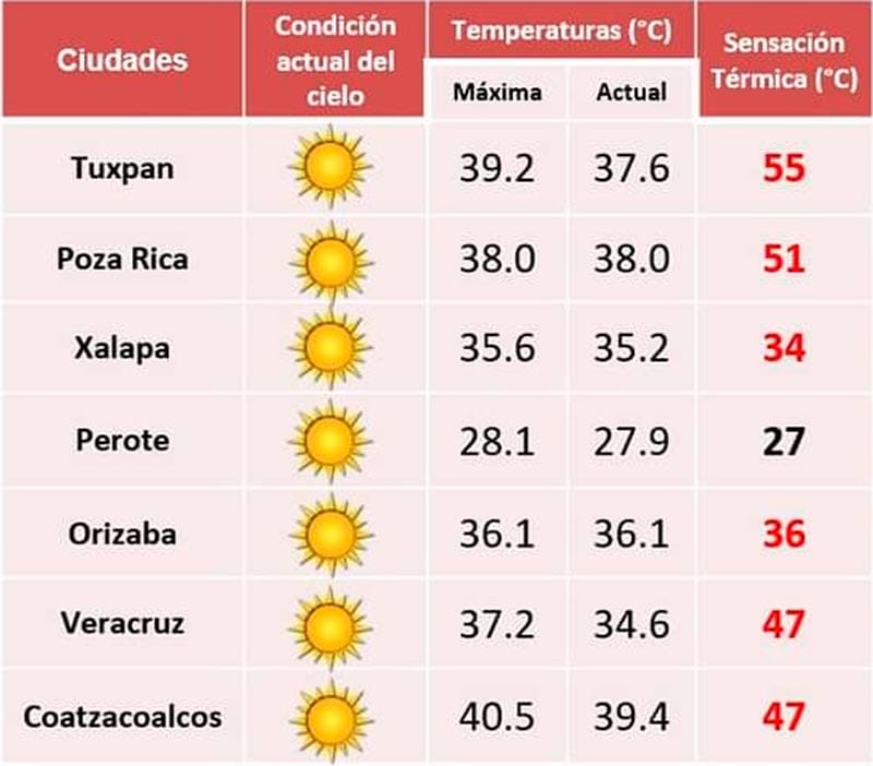 Este Puerto de Veracruz y Boca del Río registraron una temperatura de 47 a la par del municipio de Coatzacoalcos, por su parte Poza Rica tuvo 51, Xalapa 34, Perote 27 en sensación térmica, en temperatura normal a la sombra Tuxpan 39, Poza Rica 38, Xalapa 35, Perote 28, Orizaba 36, Veracruz 37.2 y Coatzacoalcos 40.5.