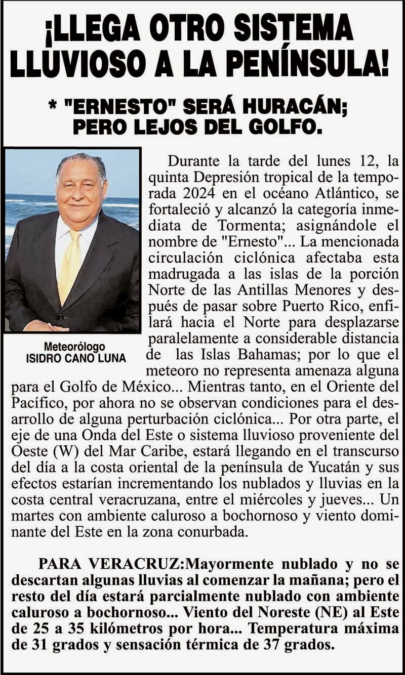 PRIMERA ¡LLEGA OTRO SISTEMA LLUVIOSO A LA PENÍNSULA! - *"ERNESTO" SERÁ HURACÁN; PERO LEJOS DEL GOLFO 13 agosto 2024 Más Noticias ¡YA HAY TERNA! - RAÚL PEIMBERT EN LA LISTA ¡“CEMENTERIO”! - DE ULÚAS ¡INAUGURA PATY OTRA CALLE! ¡NO LE CREYERON! - Y LO BUSCAN NOTI-MEME | - ECOS DEL INFORME! ¡VERÓNICA VA CON NAHLE! - Y AL CONGRESO ¡“FAST TRACK”! - *Mientras el Mariner salía y entraba de Pajaritos en Coatzacoalcos ¡OPERATIVO LUPE-REYES! ¡MANDAN LA BILLETIZA! - *Corea manda 150 mil dólares ¡CRISTINA GANA LA ELECCIÓN!