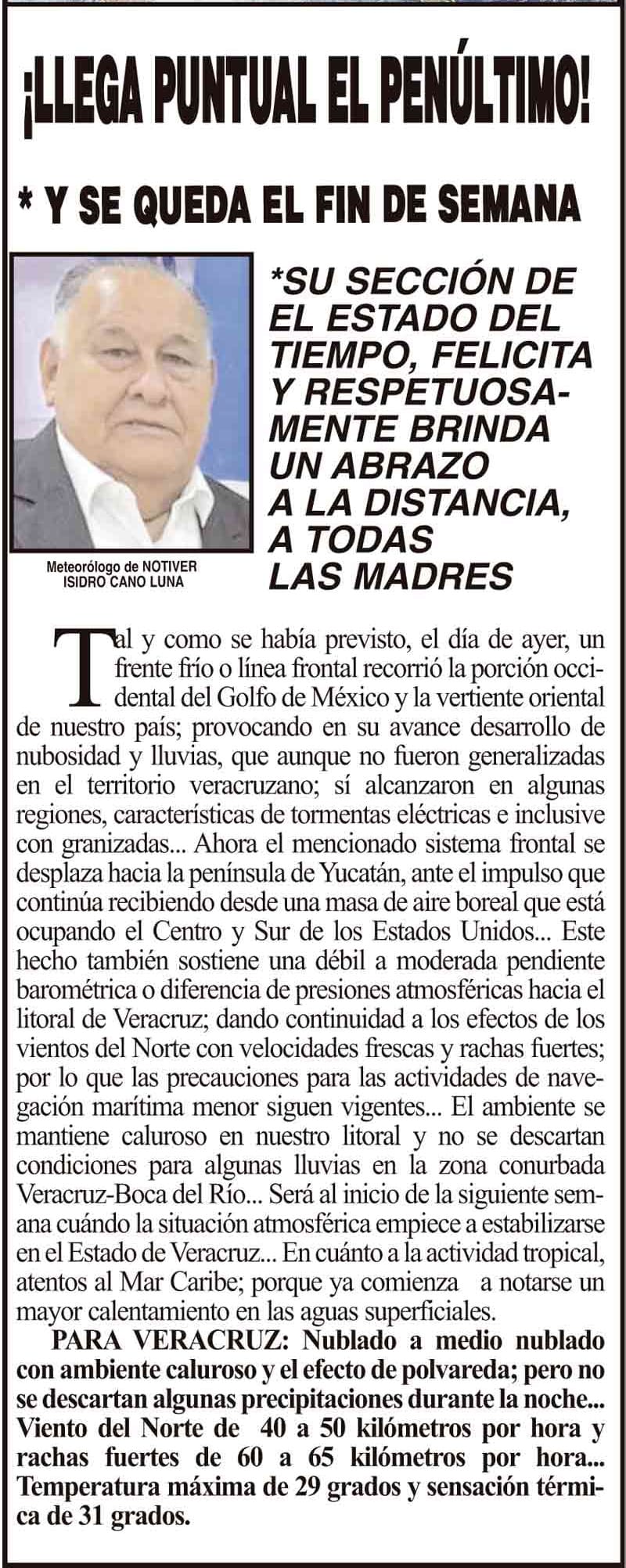 PRIMERA ¡LLEGA PUNTUAL EL PENÚLTIMO! - *Y SE QUEDA EL FIN DE SEMANA 10 mayo 2025 Más Noticias ¡BLOQUEO EN LA CARRETERA! - *Por taxistas desaparecidos ¡SI FUE PEMEX! - RE-CULAN... ¡PRENDEN CASI MIL LUMINARIAS! LOS CARTONES ¡CERRARON LA FUGA EL 14 DE FEBRERO! ¡SE DISPARA EL BARRENADOR! - *Veracruz pasa de 10 a 20 contagios por miasis ¡INVITA IMSS VERACRUZ NORTE A ACTIVAR BUZÓN IMSS PARA FACILITAR TRÁMITES Y NOTIFICACIONES! ¡APARECEN LOS ‘AUTÉNTICOS’! ¡VINIERON POR “PAPO”! ¡ECOCIDIO EN EL CAZONES! - *Muerte masiva de peces