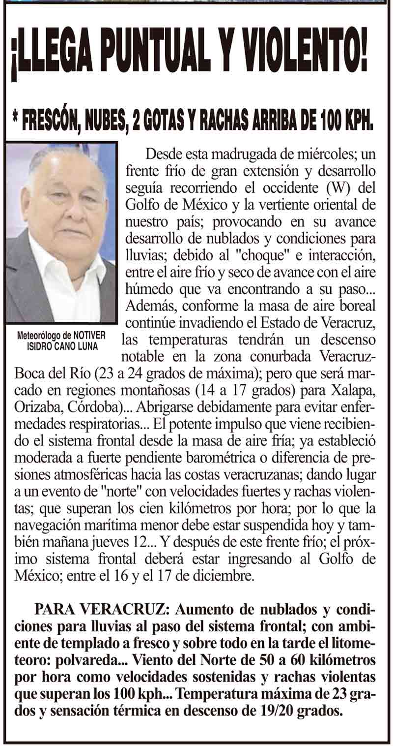 PRIMERA ¡LLEGA PUNTUAL Y VIOLENTO! - *FRESCÓN, NUBES, 2 GOTAS Y RACHAS ARRIBA DE 100 KPH. 11 diciembre 2024 Más Noticias ¡CAZARÍN LE TRAJO LA BILLETIZA! - A LOS ABUELITOS ¡NO HAY AGUA EN OCHO COLONIAS! - *Por una fuga en la red ¡EJECUTAN A FOTÓGRAFO! - EN CÓRDOBA ¡SENTENCIA HISTÓRICA! - CASO ASCENCIO ¡OTRA CALLE MÁS! ¡MUERE DIEGO FERNÁNDEZ! - “EL PAMPANO” ¡FALLECE HERMANO DE REYNALDO! ¡METEN TIJERA! - MOLES ¡SE COLAPSÓ! - EL COCOTERO DE ÁLAMO LA ENCUESTA | - CATAPLÚM!