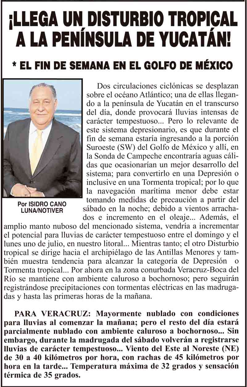 PRIMERA ¡LLEGA UN DISTURBIO TROPICAL A LA PENÍNSULA DE YUCATÁN! - *EL FIN DE SEMANA EN EL GOLFO DE MÉXICO 28 junio 2024 Más Noticias ¡ATRAPADOS! - HAY VERACRUZANOS ¡MUERE FAMILIA EN INCENDIO! - TRAGEDIA EN RÍO BLANCO ¡CAMIONES CHINOS A XALAPA! ¡SE LES APARECE MARYJOSE! LOS CARTONES FUE LA PERCEPCIÓN TÉRMICA... ¡MEGA-OPERATIVO POR CABALGATA! - *Cierres viales y de limpieza por Cabalgata nacional en Veracruz puerto NOTI-MEME | - NO AGUANTAN EL CALOR!! ¡HASTA GRANIZÓ! - PURAS BOLAS ¡CAYÓ EN XALAPA! - *Se repartirán ocho millones y medio