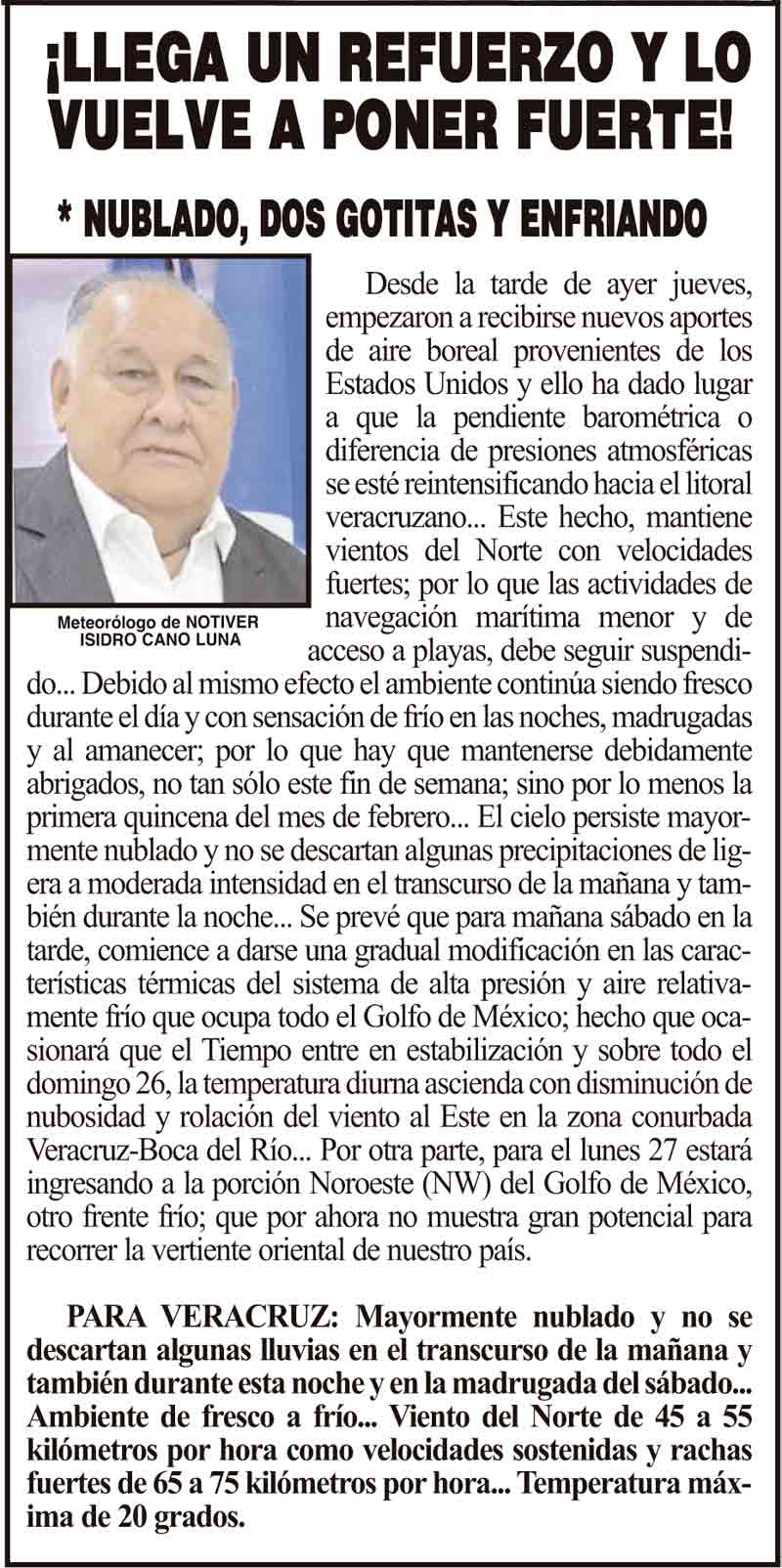 PRIMERA ¡LLEGA UN REFUERZO Y LO VUELVE A PONER FUERTE! - *NUBLADO, DOS GOTITAS Y ENFRIANDO 24 enero 2025 Más Noticias ¡YA HAY TERNA! - RAÚL PEIMBERT EN LA LISTA ¡“CEMENTERIO”! - DE ULÚAS ¡INAUGURA PATY OTRA CALLE! ¡NO LE CREYERON! - Y LO BUSCAN NOTI-MEME | - ECOS DEL INFORME! ¡VERÓNICA VA CON NAHLE! - Y AL CONGRESO ¡“FAST TRACK”! - *Mientras el Mariner salía y entraba de Pajaritos en Coatzacoalcos ¡OPERATIVO LUPE-REYES! ¡MANDAN LA BILLETIZA! - *Corea manda 150 mil dólares ¡CRISTINA GANA LA ELECCIÓN!