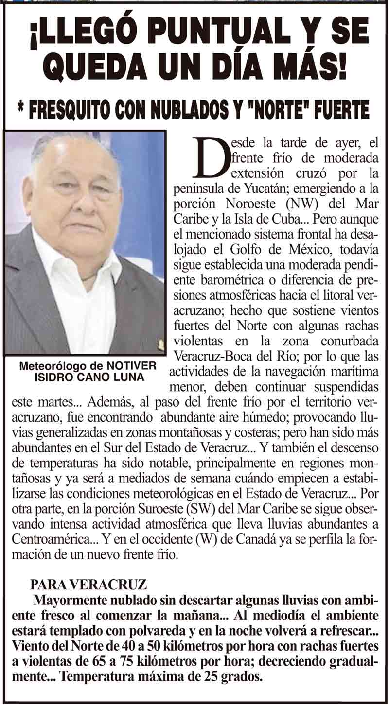 PRIMERA ¡LLEGÓ PUNTUAL Y SE QUEDA UN DÍA MÁS! - *FRESQUITO CON NUBLADOS Y "NORTE" FUERTE 11 noviembre 2025 Más Noticias LA ENCUESTA | - ME ESTÁS OYENDO INÚTIL?... ¡CON BAILONGOS QUIEREN AYUDAR A LOS DAMNIFICADOS DEL NORTE! - *El mismo Alor, toca los timbales ¡YA SE LA APROBARON! - REFORMA PARA LA FISCALÍA ESTATAL NOTI-MEME | - ASÍ ESTUVO EL INFORME... ¡MÁS DE 9 MIL MILLONES! - *Eso costaría cancelar en Veracruz al Grupo MAS ¡LE DAN LUZ VERDE! - DESDE GUATEMALA ¡EL CUARTO! ¡Y COM-PA-RE-CIÓ! - ÁNDALE... ¡NO SE VA LISBETH AURELIA! - *Descarta ir a la Fiscalía y que seguirá como magistrada ¡CREAN EL SÚPER MAÍZ!