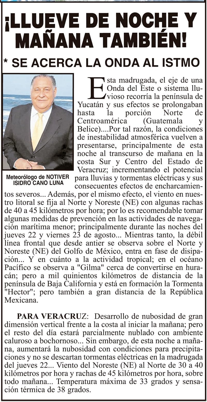 PRIMERA ¡LLUEVE DE NOCHE Y MAÑANA TAMBIÉN! - *SE ACERCA LA ONDA AL ISTMO 21 agosto 2024 Más Noticias ¡YA HAY TERNA! - RAÚL PEIMBERT EN LA LISTA ¡“CEMENTERIO”! - DE ULÚAS ¡INAUGURA PATY OTRA CALLE! ¡NO LE CREYERON! - Y LO BUSCAN NOTI-MEME | - ECOS DEL INFORME! ¡VERÓNICA VA CON NAHLE! - Y AL CONGRESO ¡“FAST TRACK”! - *Mientras el Mariner salía y entraba de Pajaritos en Coatzacoalcos ¡OPERATIVO LUPE-REYES! ¡MANDAN LA BILLETIZA! - *Corea manda 150 mil dólares ¡CRISTINA GANA LA ELECCIÓN!
