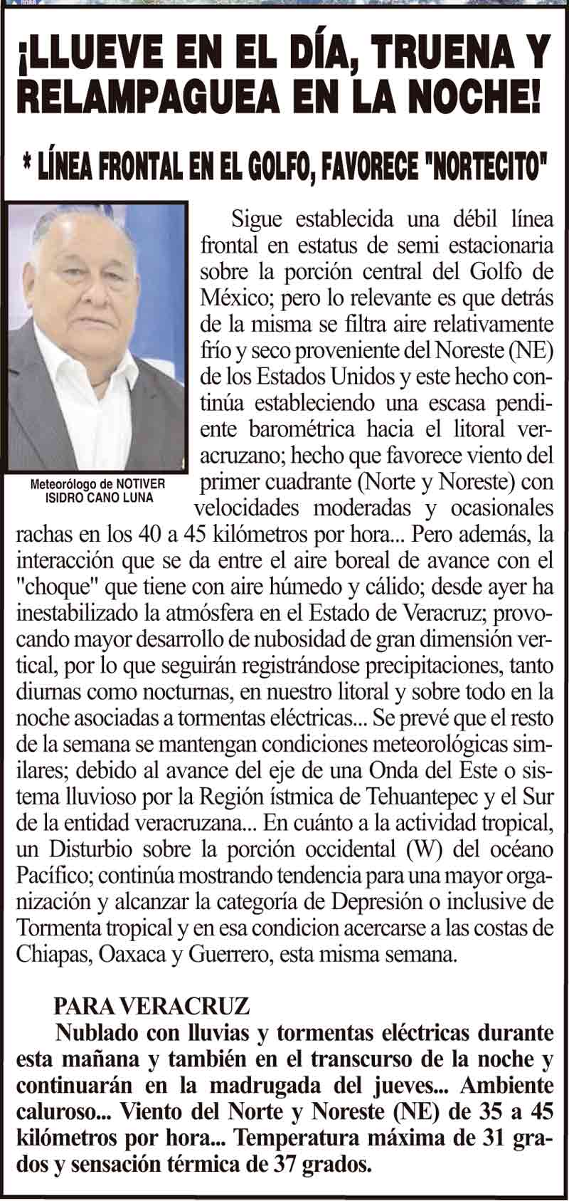 PRIMERA ¡LLUEVE EN EL DÍA, TRUENA Y RELAMPAGUEA EN LA NOCHE! - *LÍNEA FRONTAL EN EL GOLFO, FAVORECE "NORTECITO" 10 septiembre 2025 Más Noticias LA ENCUESTA | - ME ESTÁS OYENDO INÚTIL?... ¡CON BAILONGOS QUIEREN AYUDAR A LOS DAMNIFICADOS DEL NORTE! - *El mismo Alor, toca los timbales ¡YA SE LA APROBARON! - REFORMA PARA LA FISCALÍA ESTATAL NOTI-MEME | - ASÍ ESTUVO EL INFORME... ¡MÁS DE 9 MIL MILLONES! - *Eso costaría cancelar en Veracruz al Grupo MAS ¡LE DAN LUZ VERDE! - DESDE GUATEMALA ¡EL CUARTO! ¡Y COM-PA-RE-CIÓ! - ÁNDALE... ¡NO SE VA LISBETH AURELIA! - *Descarta ir a la Fiscalía y que seguirá como magistrada ¡CREAN EL SÚPER MAÍZ!