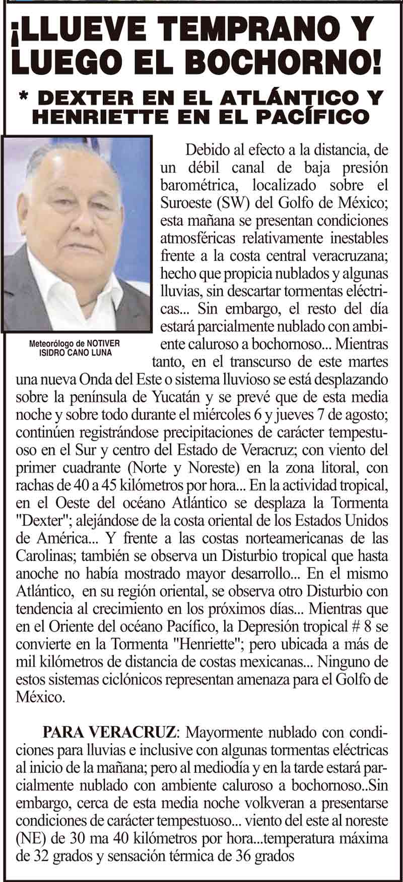 PRIMERA ¡LLUEVE TEMPRANO Y LUEGO EL BOCHORNO! - *DEXTER EN EL ATLÁNTICO Y HENRIETTE EN EL PACÍFICO 5 agosto 2025 Más Noticias ¡TRIPLE FEMINICIDIO! - TERROR EN TLAPACOYAN ¡A SACAR SUÉTERES! - *Alertan por el Frente Frío 18 ¡HABEMUS CORTE! - CARNAVAL 2026 ¡CLAUSURAN GRANJAS AVÍCOLAS! - *En Lerdo por falta de permisos 2025 ¡ATAQUE ARMADO A TRÁILER! - *No era de los Junior's Klan LOS CARTONES ¡CONMEMORARÁN EL ANIVERSARIO 112 DEL NATALICIO DEL “PIRATA” FUENTE! ¡PEGARÁ NORTAZO! - *Traerá rachas de 85 a 110 kph ¡SERÁ SALMA EMBAJADORA! - DEL MUNDIAL FIFA NOTI-MEME | - YA TIENES TU STARFUCKS?