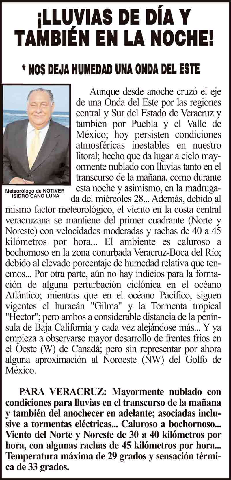 PRIMERA ¡LLUVIAS DE DÍA Y TAMBIÉN EN LA NOCHE! - *NOS DEJA HUMEDAD UNA ONDA DEL ESTE 27 agosto 2024 Más Noticias ¡YA HAY TERNA! - RAÚL PEIMBERT EN LA LISTA ¡“CEMENTERIO”! - DE ULÚAS ¡INAUGURA PATY OTRA CALLE! ¡NO LE CREYERON! - Y LO BUSCAN NOTI-MEME | - ECOS DEL INFORME! ¡VERÓNICA VA CON NAHLE! - Y AL CONGRESO ¡“FAST TRACK”! - *Mientras el Mariner salía y entraba de Pajaritos en Coatzacoalcos ¡OPERATIVO LUPE-REYES! ¡MANDAN LA BILLETIZA! - *Corea manda 150 mil dólares ¡CRISTINA GANA LA ELECCIÓN!