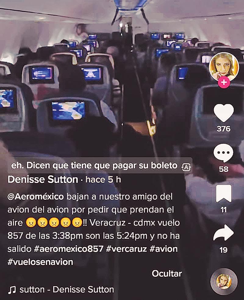 La usuaria de la red social Tik Tok, Denisse Sutton, manifestó su indignación en contra de la aerolínea luego de que dijo el vuelo de Aeroméxico número 857 estaba programado para salir a las 3:38 de la tarde y a las 5:24 no había salido.