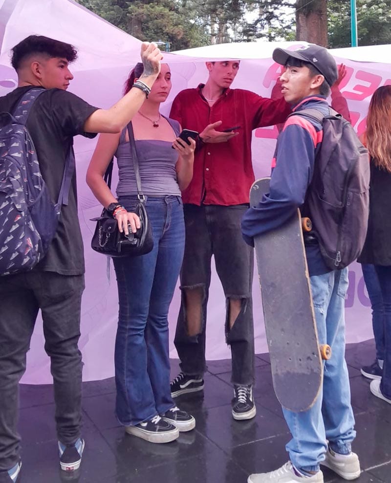 Algunos jóvenes se negaron a identificarse, mientras un grupo de mujeres con blusas moradas, cubriéndose el rostro, gritaban de todo..