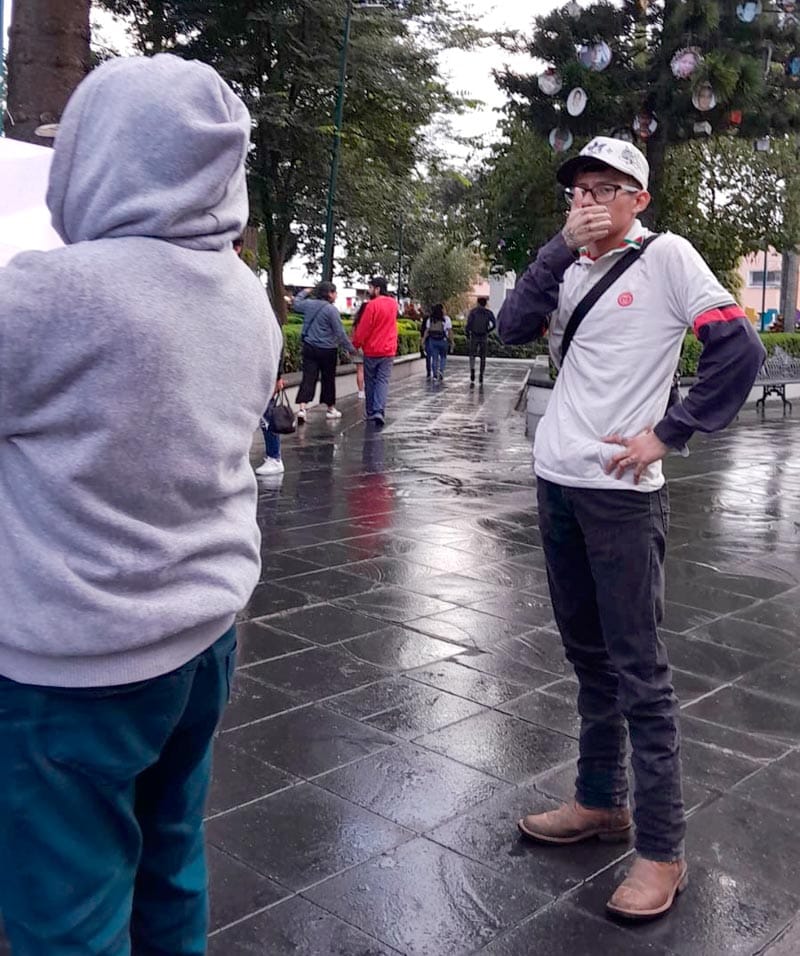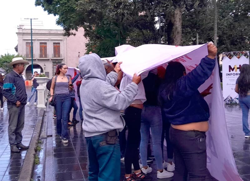 Un grupo personas llegaron a protestar. en el informe del senador de MORENA, Manuel Huerta. Algunos jóvenes se negaron a identificarse, mientras un grupo de mujeres con blusas moradas, cubriéndose el rostro, le gritaban de todo al senador Huerta. Fotos de redes y agencias.