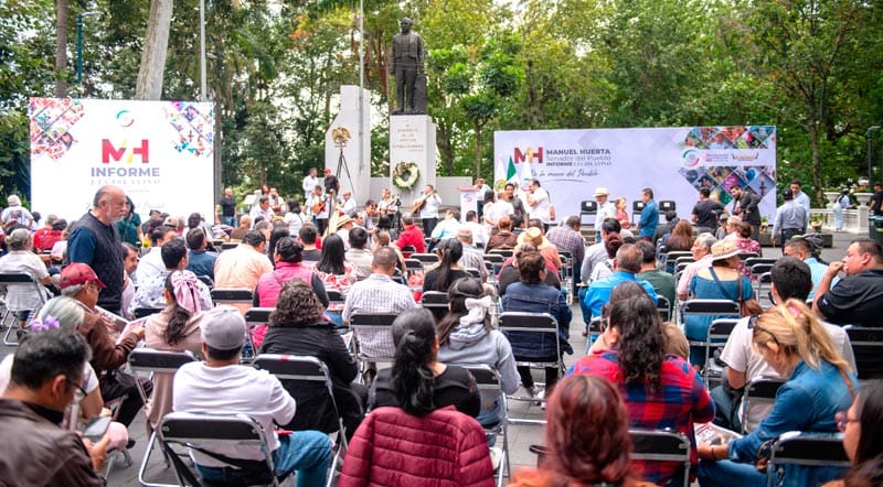 El senador de Morena, Manuel Huerta Ladrón de Guevara, presentó su informe legislativo en el Parque Juárez, en lo que llamó una "plaza pública".