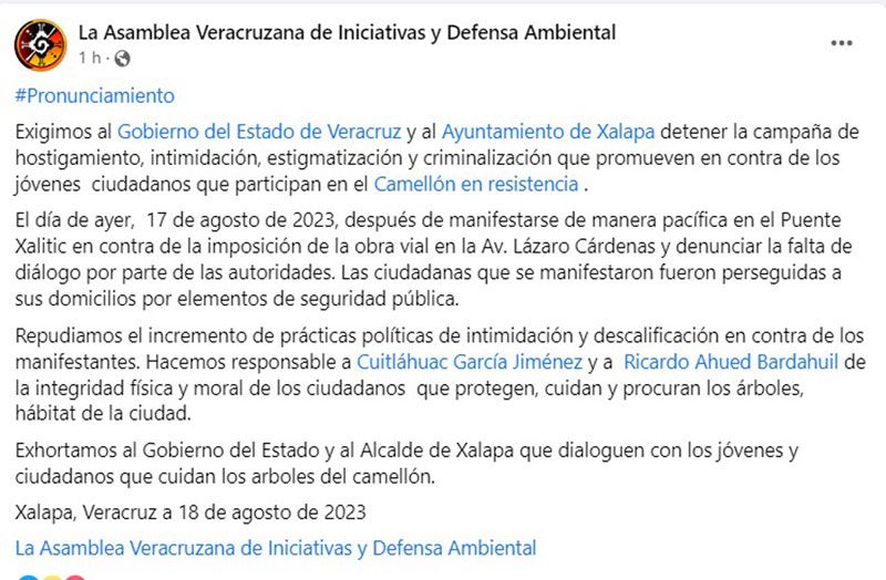 Tras esto, los ambientalistas dijeron que están siendo acosados por el Gobierno, por lo que emitieron el siguiente posicionamiento apoyados por integrantes de la Asamblea Veracruzana de Iniciativas y Defensa Ambiental (LaVida).