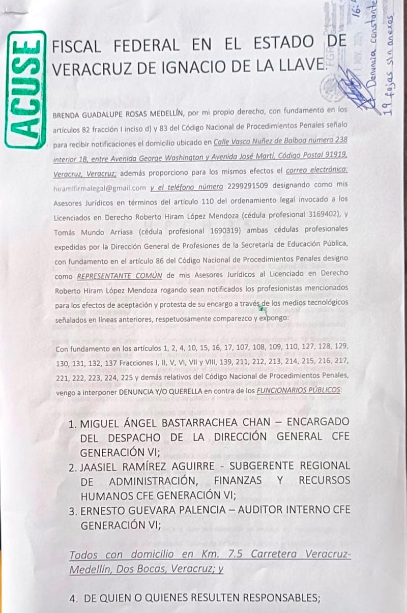 La denuncia interpuesta por la agraviada Brenda Guadalupe Rosas Medellín, quien funge como jefa del Departamento Regional de Relaciones Industriales de CFE Generación VI, es en contra Miguel Ángel Bastarrachea Chan, Jassiel Ramírez Aguirre y Ernesto Guevara Palencia, todos con base en Dos Bocas.