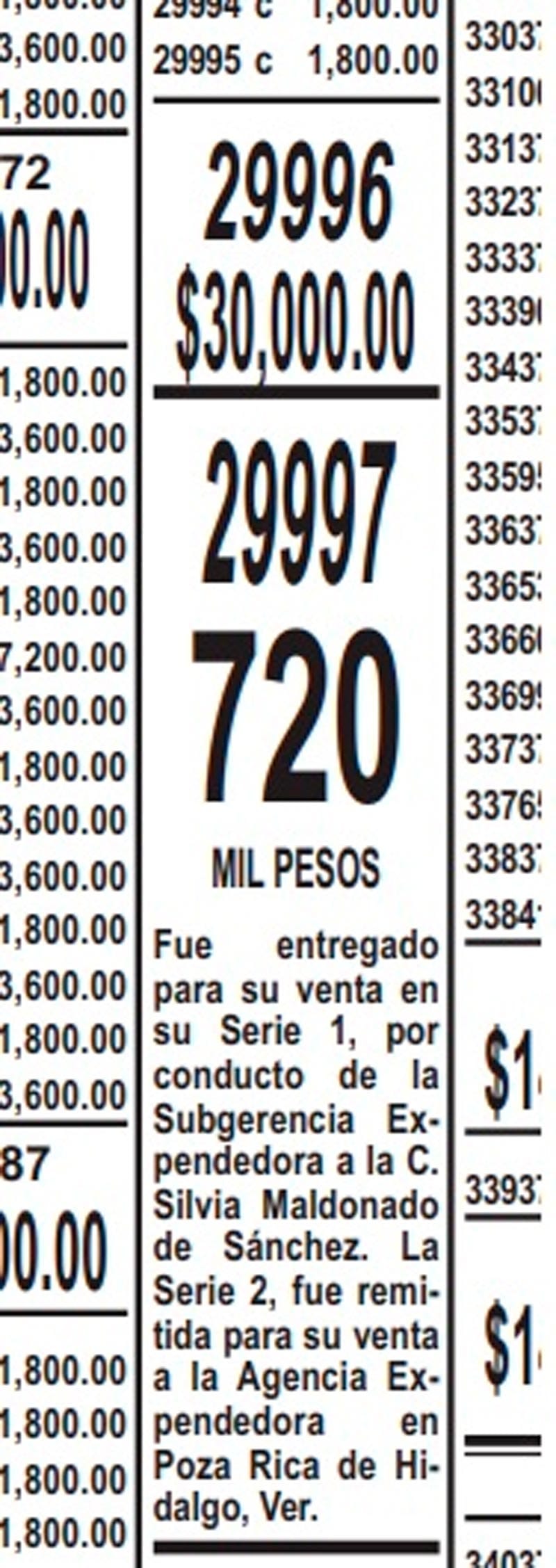 Tocó al número 29 997 que salió premiado con 720 mil pesos, según la bitácora dada a conocer, "fue entregado para su venta en su serie 1 por conducto de la subgerencia expendedora de la C. Silvia Maldonado de Sánchez y la serie 2 fue remitida para su venta en la agencia expendedora en Poza Rica de Hidalgo, Veracruz".