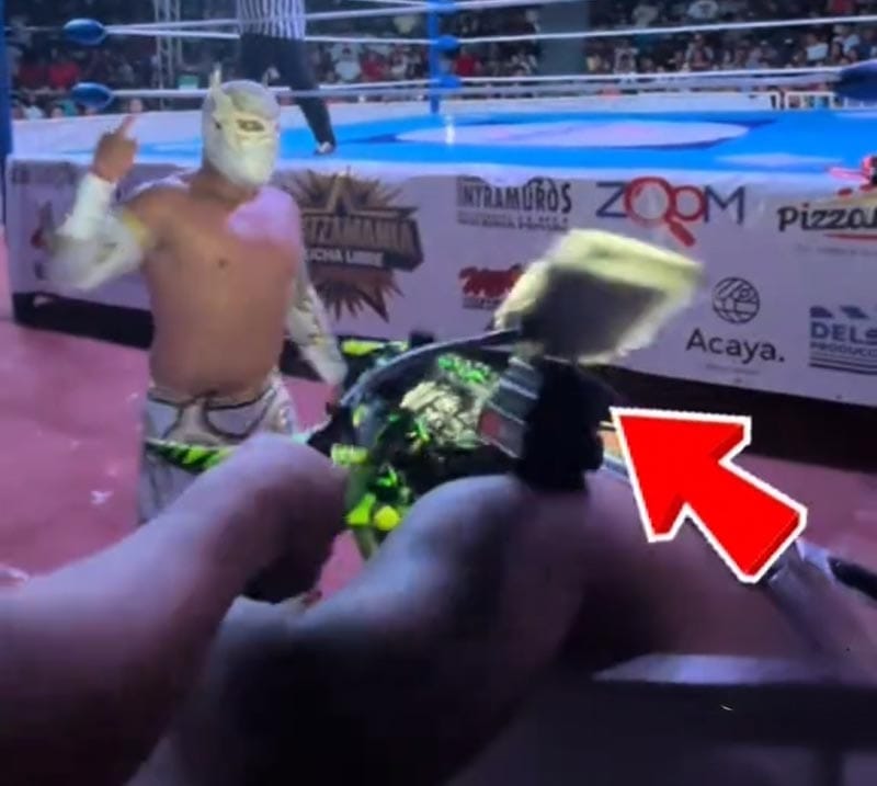 El enmascarado cayó cerca de las butacas donde estaban los creadores de contenido y de repente, un inadaptado, que todavía no está identificado, tomó su tripié con todo y teléfono y carcasa y le asentó un golpe en la cabeza al luchador.