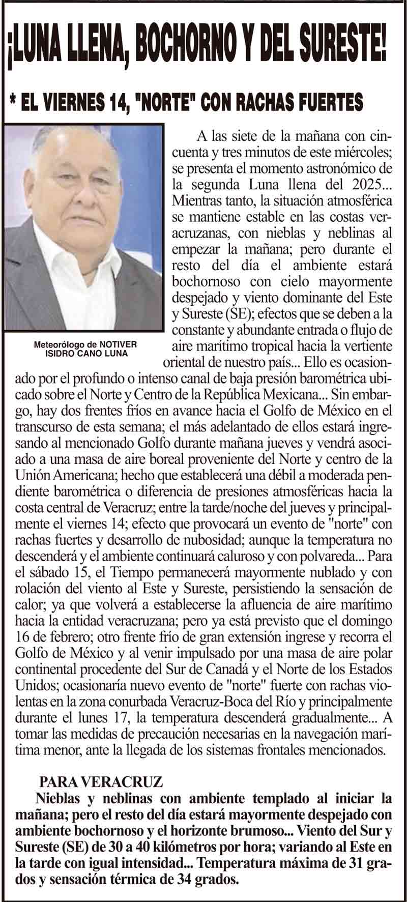 PRIMERA ¡LUNA LLENA, BOCHORNO Y DEL SURESTE! - *EL VIERNES 14, "NORTE" CON RACHAS FUERTES 12 febrero 2025 Más Noticias ¡BLOQUEO DEL SECTOR SALUD EN PLAN DE RÍO! ¡TRAGEDIA EN LA AUTOPISTA VERACRUZ–XALAPA! NOTI-MEME | - YA LLEGÓ LA RAMA! LA ENCUESTA | - YA VIENE! ¡RECONOCIMIENTO A DIRIGENTE DE TAXISTAS! ¡LE VAN A ENTRAR! - *Claudia ordena a Nahle ¡QUIEREN MANDOS DE LA MARINA! - EN LAS POLICÍAS MUNICIPALES ¡ATACA EL VIRUS COXSACKIE, HAY 71 CASOS! - *Con mayor incidencia en 2025 y casos concentrados en Xalapa y Veracruz LOS CARTONES ¡SALMA SACA VIDEO! - RETEMUNDIAL...