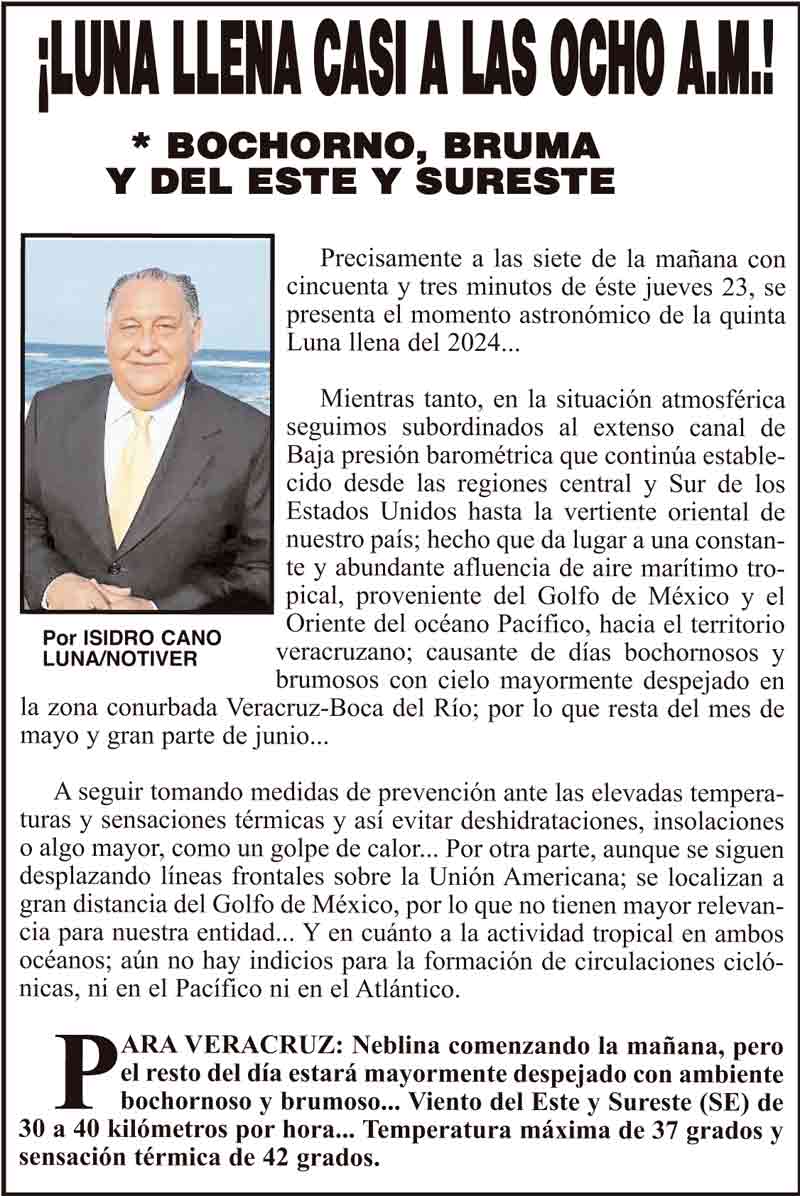 PRIMERA ¡LUNA LLENA CASI A LAS OCHO A.M.! - *BOCHORNO, BRUMA Y DEL ESTE Y SURESTE 23 mayo 2024 Más Noticias ¡YA HAY TERNA! - RAÚL PEIMBERT EN LA LISTA ¡“CEMENTERIO”! - DE ULÚAS ¡INAUGURA PATY OTRA CALLE! ¡NO LE CREYERON! - Y LO BUSCAN NOTI-MEME | - ECOS DEL INFORME! ¡VERÓNICA VA CON NAHLE! - Y AL CONGRESO ¡“FAST TRACK”! - *Mientras el Mariner salía y entraba de Pajaritos en Coatzacoalcos ¡OPERATIVO LUPE-REYES! ¡MANDAN LA BILLETIZA! - *Corea manda 150 mil dólares ¡CRISTINA GANA LA ELECCIÓN!