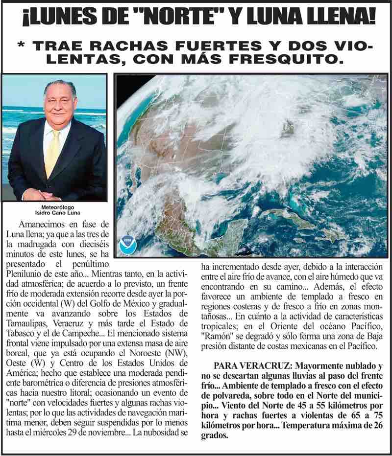 PRIMERA ¡LUNES DE "NORTE" Y LUNA LLENA! * TRAE RACHAS FUERTES Y DOS VIOLENTAS, CON MÁS FRESQUITO. 27 noviembre 2023 Más Noticias ¡YA HAY TERNA! - RAÚL PEIMBERT EN LA LISTA ¡“CEMENTERIO”! - DE ULÚAS ¡INAUGURA PATY OTRA CALLE! ¡NO LE CREYERON! - Y LO BUSCAN NOTI-MEME | - ECOS DEL INFORME! ¡VERÓNICA VA CON NAHLE! - Y AL CONGRESO ¡“FAST TRACK”! - *Mientras el Mariner salía y entraba de Pajaritos en Coatzacoalcos ¡OPERATIVO LUPE-REYES! ¡MANDAN LA BILLETIZA! - *Corea manda 150 mil dólares ¡CRISTINA GANA LA ELECCIÓN!