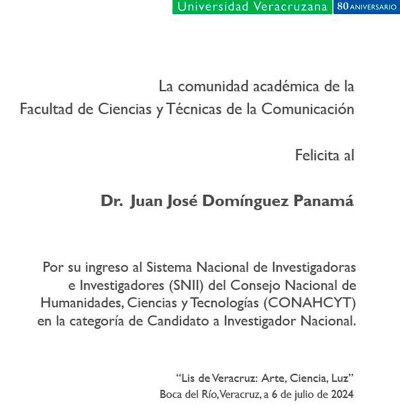 La comunidad académica de la Facultad de Ciencias y Técnicas de la Comunicación, felicitó al doctor Juan José Domínguez Panamá por su ingreso al Sistema Nacional de Investigadoras e Investigadores, SNII, del consejo Nacional de Humanidades Ciencias y Tecnologías CONAHCYT, en la categoría de candidato a investigador nacional.