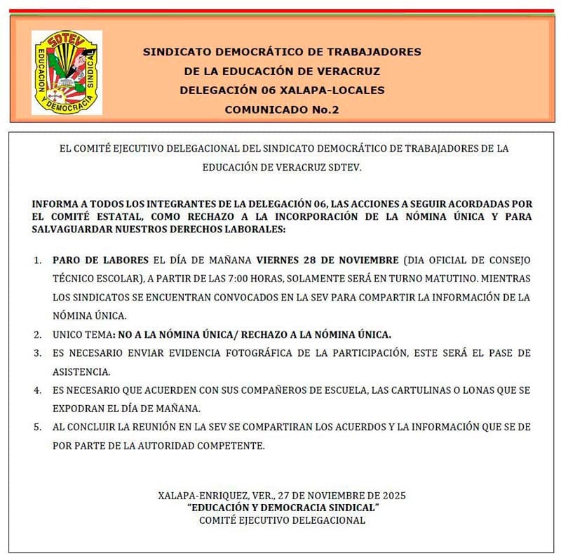 El SNTE Sección 56 se sumó a las voces de rechazo con una petición formal a la titular de la SEV, Claudia Tello Espinosa, para que posponga la aplicación de la Nómina Única hasta el año 2026.