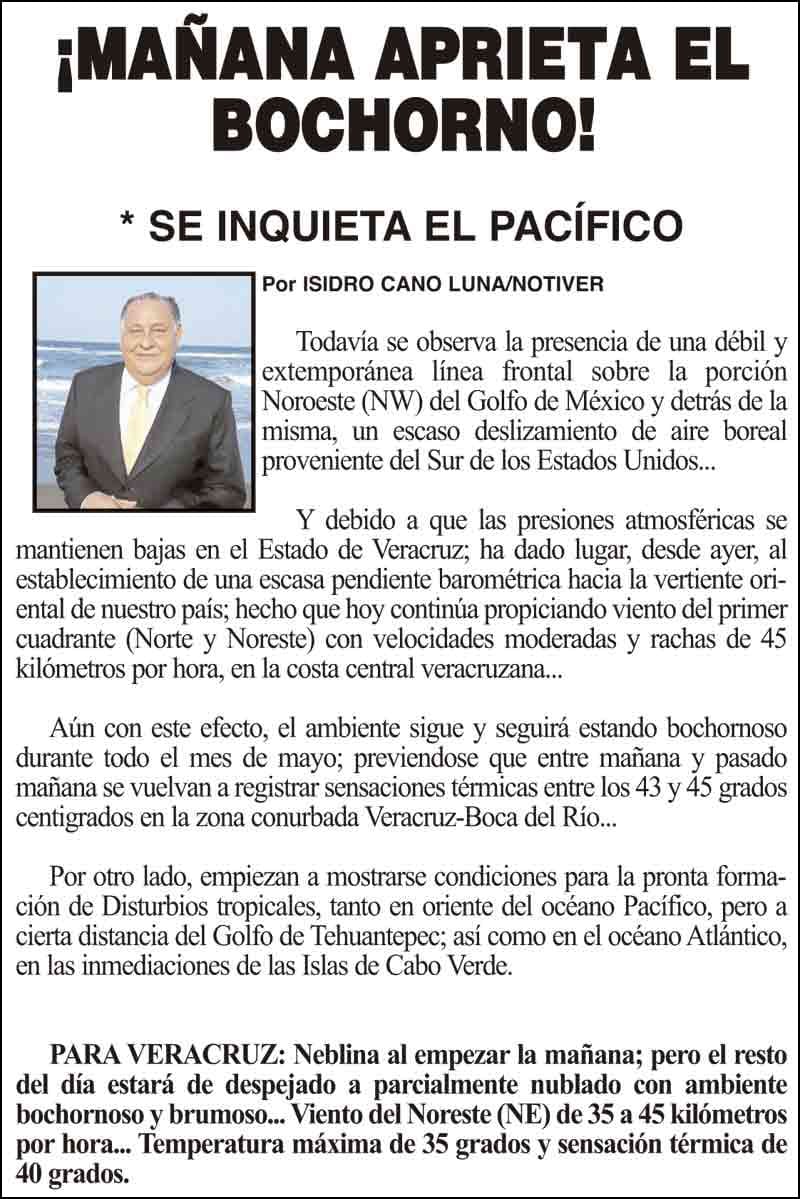 PRIMERA ¡MAÑANA APRIETA EL BOCHORNO! - *SE INQUIETA EL PACÍFICO 15 mayo 2024 Más Noticias ¡LLEGAN CHINOS A VER EL TRANVÍA! ¡PRIMER LUGAR EN HOMICIDIOS DOLOSOS! - TENIA QUE SER ¡MARYJOSE TENDRÁ SU HOSPITAL! ¡LOS DEJARON SOLOS! - A FAMILIARES DE LA DOCTORA ASESINADA ¡SE LO MOCHAN A EX ALCALDE! - DE COATZA ¡RECONOCEN A CONCHITA DÍAZ CHÁZARO! - *Es la Cronista de la Ciudad NOTI-MEME | - QUÉ LIBRO VAS A REGALAR! ¡SIGUE LA RACHA! ¡CONSTERNACIÓN! - *Muere el profesor Roque Velázquez Rivera LOS CARTONES
