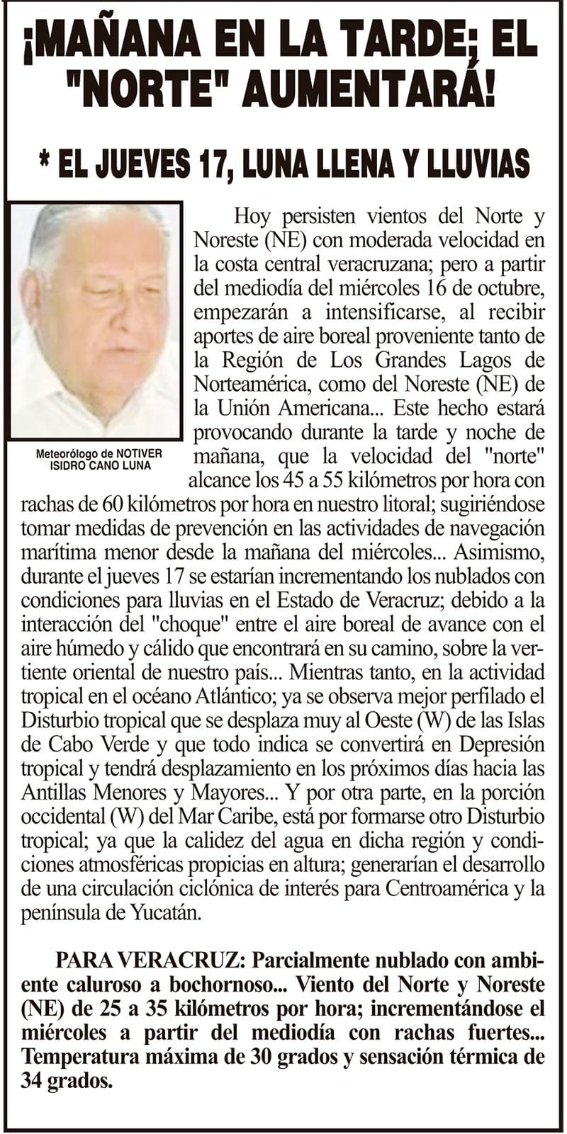 PRIMERA ¡MAÑANA EN LA TARDE; EL "NORTE" AUMENTARÁ! - *EL JUEVES 17, LUNA LLENA Y LLUVIAS 15 octubre 2024 Más Noticias ¡ASESINAN A EX CANDIDATO A LA ALCALDÍA DE MISANTLA! - *Era del Movimiento Ciudadano ¡HOMENAJE PÓSTUMO AL “PAPO”! ¡SE VA EL FOFO! - DEL PRI LA ENCUESTA | - FELICIDADES! ¡SE DESCARRILA EL TREN! - PA’SUSTO ¡YA NO COBRARÁN PARQUÍMETROS! ¡SE VAN POR LAS NUBES LOS PAVOS! ¡DETECTAR DISFAGIA A TIEMPO PREVIENE LAS COMPLICACIONES DE SALUD: IMSS VERACRUZ NORTE! ¡CUATRO MUNICIPIOS SUBIRÁN EL PREDIAL! - YA SE SUPO ¡CUMBRE DE TRANSPORTE MULTIMODAL!