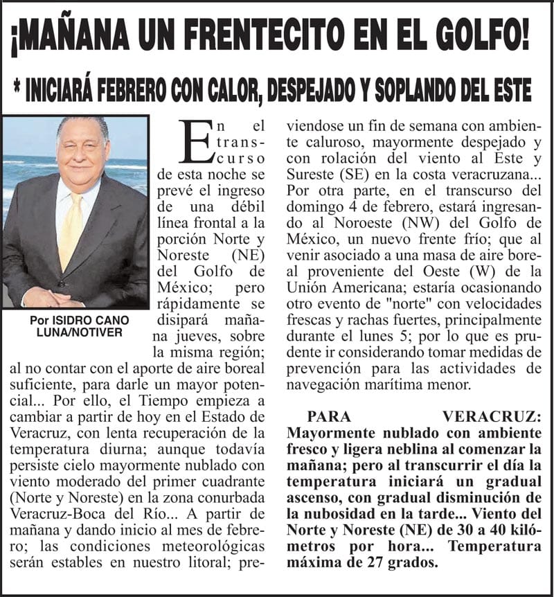 PRIMERA ¡MAÑANA UN FRENTECITO EN EL GOLFO! INICIARÁ FEBRERO CON CALOR, DESPEJADO Y SOPLANDO DEL ESTE 31 enero 2024 Más Noticias ¡LLEGAN CHINOS A VER EL TRANVÍA! ¡PRIMER LUGAR EN HOMICIDIOS DOLOSOS! - TENIA QUE SER ¡MARYJOSE TENDRÁ SU HOSPITAL! ¡LOS DEJARON SOLOS! - A FAMILIARES DE LA DOCTORA ASESINADA ¡SE LO MOCHAN A EX ALCALDE! - DE COATZA ¡RECONOCEN A CONCHITA DÍAZ CHÁZARO! - *Es la Cronista de la Ciudad NOTI-MEME | - QUÉ LIBRO VAS A REGALAR! ¡SIGUE LA RACHA! ¡CONSTERNACIÓN! - *Muere el profesor Roque Velázquez Rivera LOS CARTONES