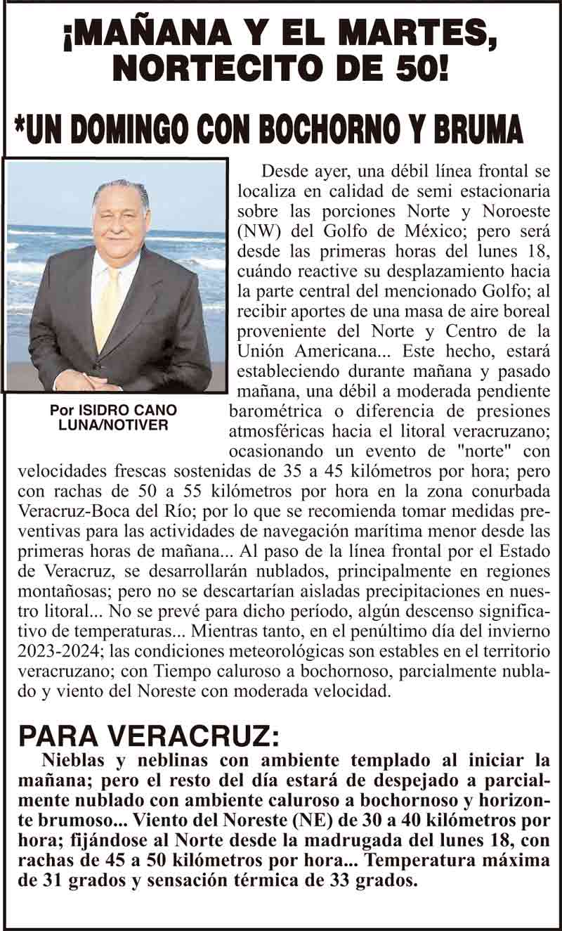 PRIMERA ¡MAÑANA Y EL MARTES, NORTECITO DE 50! - *UN DOMINGO CON BOCHORNO Y BRUMA 17 marzo 2024 Más Noticias ¡COMIENZA “PONTE OREJA”! - *100 boqueños beneficiados con estudios de audiometría ¡NI UNA BOMBA MÁS! - POR AHORA... ¡CAMBIOS EN LA CANACAR! ¡PELÍCANOS MUERTOS! - ALERTAN CONTAMINACIÓN ¡VA LA UV! - AL OBSERVATORIO ¡CARAMBOLA TRÁGICA! - EN LAS CUMBRES ¡PARAN LOS QUETZALLI! - *Operadores realizaron paro parcial por jornadas de casi 20 horas y bajos pagos ¡SE VAN A ASTURIAS! ¡MANIOBRISTAS VS. PULIDO! - YA SE ARMÓ ¡CHAPOPOTAZO! - PA’SUMECHA