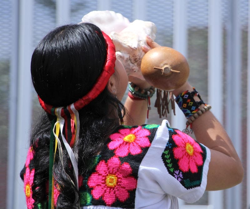 La oradora principal pidió a los asistentes que se movieran en diversas direcciones con las manos alzadas mientras sonaba un caracol.