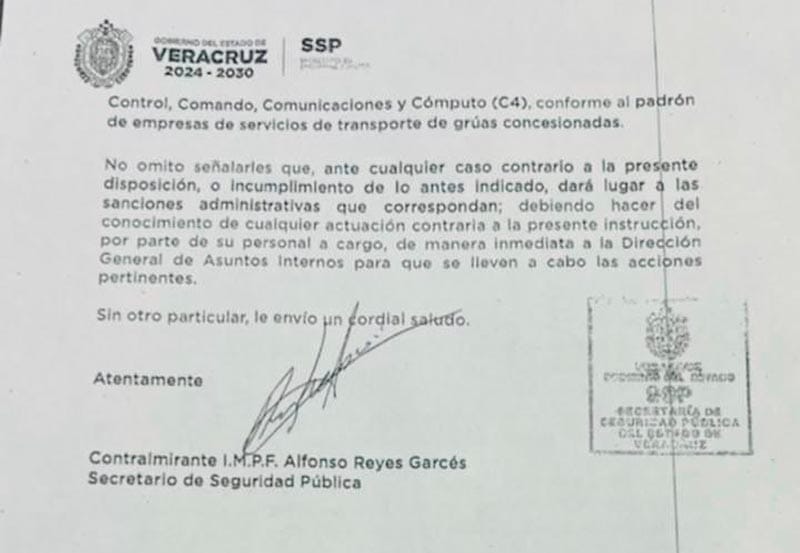 El titular de la Secretaría de Seguridad Pública (SSP) Alfonso Reyes Garcés, ordenó frenar el abuso de grúas en el estado de Veracruz.