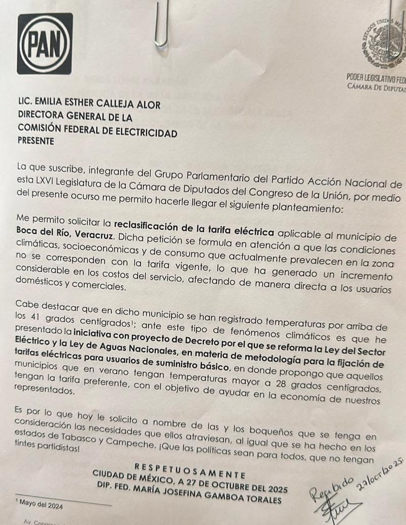 (AVC) En el marco de la Comparecencia de la Directora General de la Comisión Federal de Electricidad (CFE), Emilia Esther Calleja Alor, la diputada federal del PAN, Maryjose Gamboa, solicitó reclasificar las tarifas de energía eléctrica en el municipio de Boca del Río, “ya que las condiciones climáticas, socioeconómicas y de consumo que actualmente prevalecen en la zona no corresponden a la tarifa vigente”, señaló.