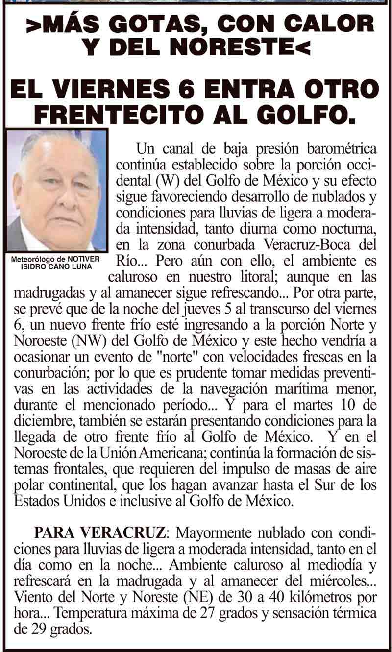 PRIMERA >MÁS GOTAS, CON CALOR Y DEL NORESTE< - EL VIERNES 6 ENTRA OTRO FRENTECITO AL GOLFO. 3 diciembre 2024 Más Noticias ¡YA HAY TERNA! - RAÚL PEIMBERT EN LA LISTA ¡“CEMENTERIO”! - DE ULÚAS ¡INAUGURA PATY OTRA CALLE! ¡NO LE CREYERON! - Y LO BUSCAN NOTI-MEME | - ECOS DEL INFORME! ¡VERÓNICA VA CON NAHLE! - Y AL CONGRESO ¡“FAST TRACK”! - *Mientras el Mariner salía y entraba de Pajaritos en Coatzacoalcos ¡OPERATIVO LUPE-REYES! ¡MANDAN LA BILLETIZA! - *Corea manda 150 mil dólares ¡CRISTINA GANA LA ELECCIÓN!