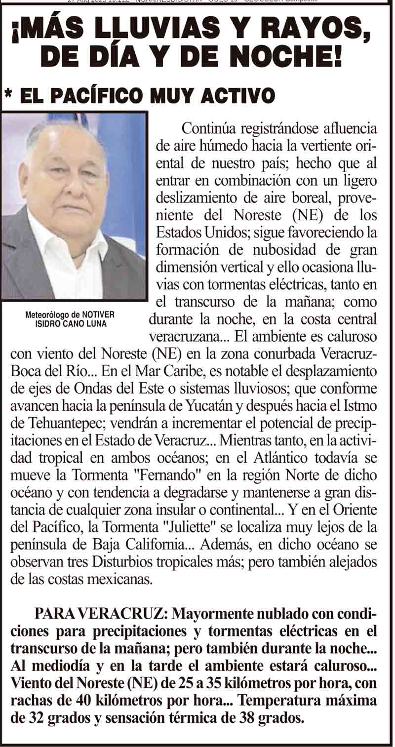 PRIMERA ¡MÁS LLUVIAS Y RAYOS, DE DÍA Y DE NOCHE! - *EL PACÍFICO MUY ACTIVO 28 agosto 2025 Más Noticias ¡HOY SOPLA FRESCO Y DE FRENTE! - *PERO EL LUNES 8, ESTARÁ FUERTE Y CON LLUVIAS. LA ENCUESTA | - ME ESTÁS OYENDO INÚTIL?... ¡CON BAILONGOS QUIEREN AYUDAR A LOS DAMNIFICADOS DEL NORTE! - *El mismo Alor, toca los timbales ¡YA SE LA APROBARON! - REFORMA PARA LA FISCALÍA ESTATAL NOTI-MEME | - ASÍ ESTUVO EL INFORME... ¡MÁS DE 9 MIL MILLONES! - *Eso costaría cancelar en Veracruz al Grupo MAS ¡LE DAN LUZ VERDE! - DESDE GUATEMALA ¡EL CUARTO! ¡Y COM-PA-RE-CIÓ! - ÁNDALE... ¡NO SE VA LISBETH AURELIA! - *Descarta ir a la Fiscalía y que seguirá como magistrada